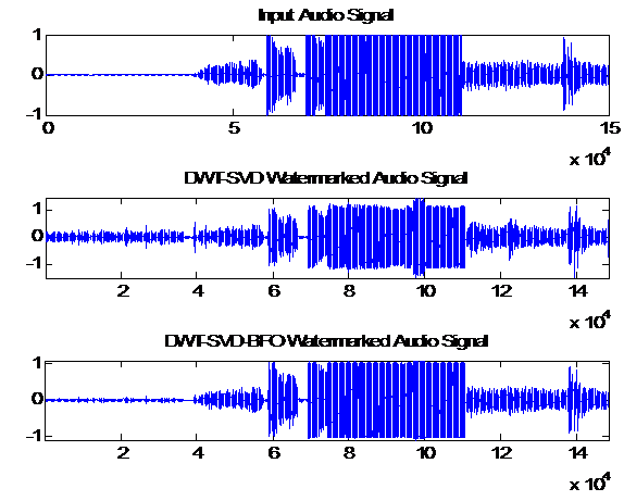 Figure 1 spectrum of the original audio signal, DWT-SVD watermarked audio signal, and DWT-SVD-BFO watermarked audio signal