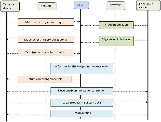 In the first case, the terminal device processed a task so mode selection service request sends to the SDN controller. The response provided to the service request received all the information is transmitted to the SDN controller like task data, computation ability of the device, the content of data, observational amount and higher tolerance time. Similarly, the fog and cloud computing are sent their information like bandwidth range, transmission power and computation capacity to the SDN controller. The real time based tasks during cloud and fog computing achieved via WOA optimization algorithm processing within the SDN controller.