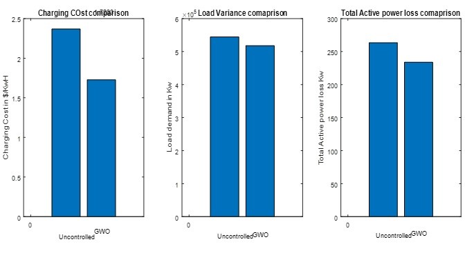 The GWO controlled EV charging rescheduling minimizes the power loss of the grid, load variation and cost of charging power. Figure 3 shows the comparison among the three optimized objective functions which are formulated above.