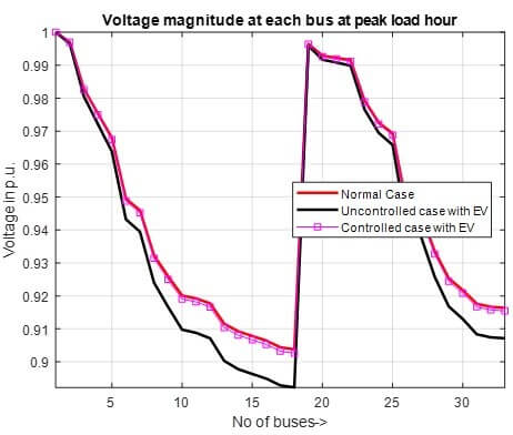 The entire work is designed in the MATLAB 2018a software. We take the IEEE33 bus radial distribution system model and inserted 10 EV charging stations on selected buses. The bus numbers 3, 6, 10, 14, 19, 22, 23, 25, 29, and 31 are selected for the installation of the charging station of electric vehicles. The plugin EV load connected to the charging station is divided into two categories low and high penetration level. The number of plug-in EV is higher in high penetration level and lower in low penetration level.