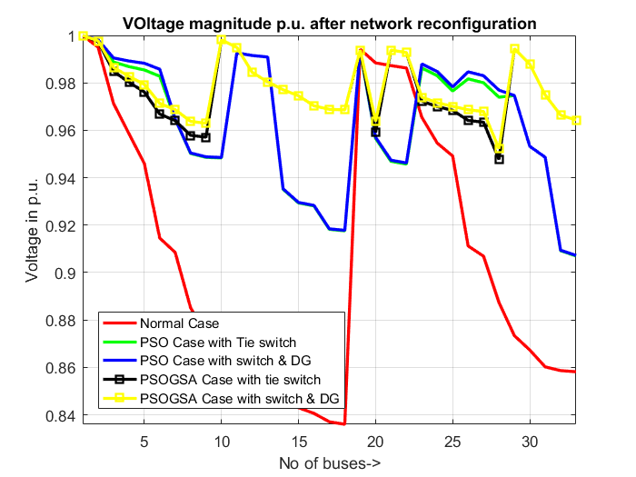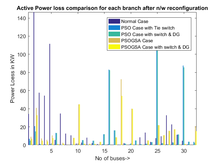 Where variable ‘S’ contains the apparent load matrix. backward/Forward Load flow analysis is done on IEEE 33 radial bus system at free-thesis.com. The root soul of our system is the objective function which changes the tie switch positions and places the Distribution generators in the network. For IEEE 33 radial bus system, we have a choice of tap switches to be opened or closed. Optimal opening/closing of tie switches must be among them during PSOGSA optimization. These are