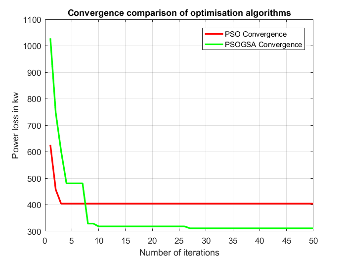 IEEE 33 radial bus system is considered for this case. The optimization used is the hybrid PSO GSA (particles Swarm optimisation and Gravitational Search Algorithm). The IEEE 33 bus system data is loaded and bus loading is changed to demonstrate the effective optimization algorithm. The load is increased by 1.6 times as