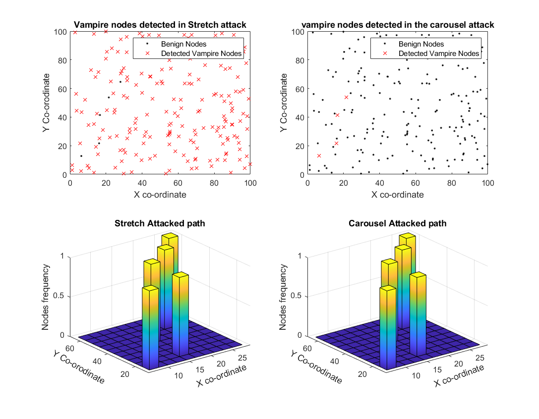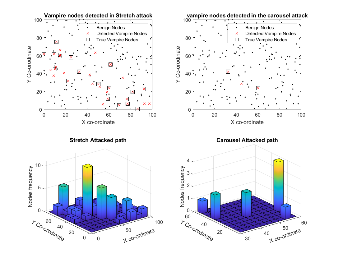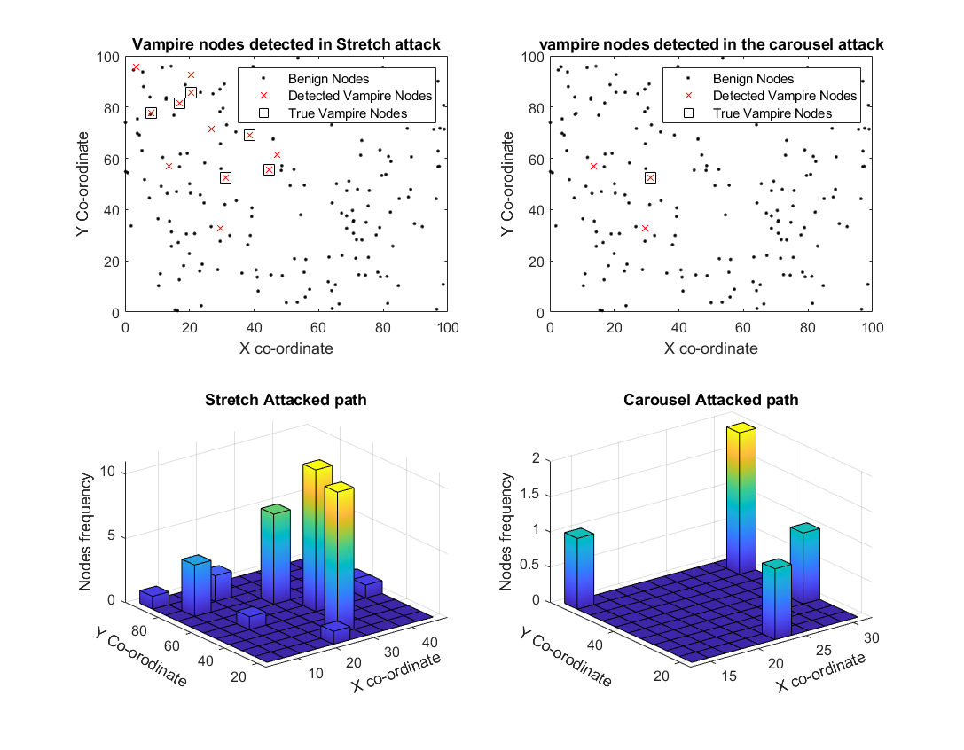 The current algorithm is evaluated in a simulated WSN scenario with 80% vampire nodes in the network. The figure below shows the detected vampire nodes and true vampire nodes labeled in the DSR path for both carousel and stretch attacks.