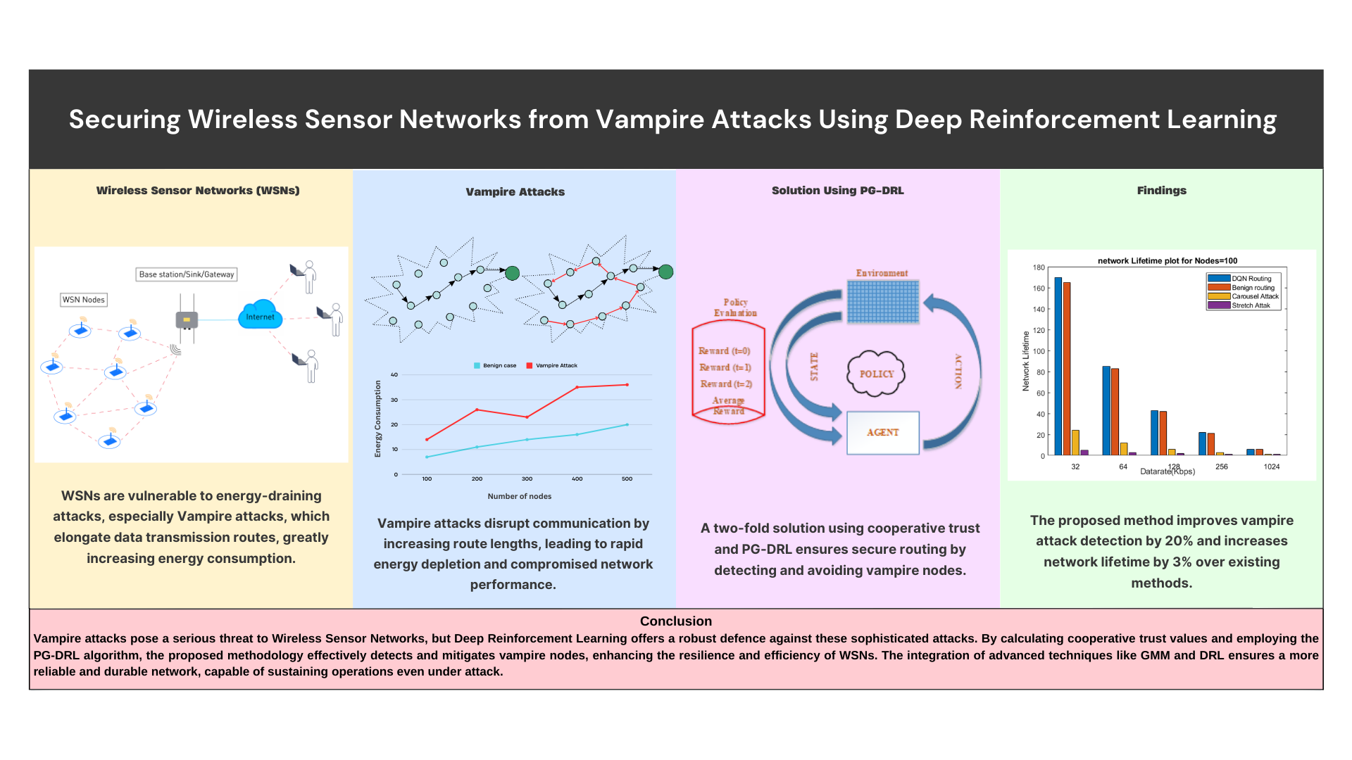 - A reinforcement learning-based routing algorithm is developed that chooses the next hop for data transfer in real time to stop vampire attacks.