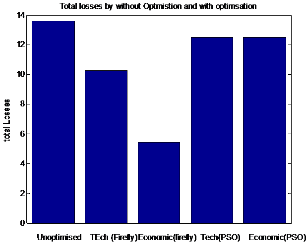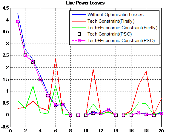 If extra generators are installed on each bus in the system, it will definitely increase the cost, and losses cost will be less than that. So it is necessary to choose some potential buses at which generators can be placed. For this purpose, the sensitivity index is calculated in our work. It will arrange all buses in the decreasing order of power losses. Then as per the cost minimization and losses minimization, a number of buses which art at top of the list can be chosen and generators will be installed only on that. The detailed mathematical formulation of the sensitivity index is discussed in section 1. after locating the potential buses which are having high loss, the problem of placing the right size generator is rising face. Optimal sizing of the generator reduces cost and losses significantly. For this purpose, we have used an objective function that considers the losses minimized as well as cost minimized for the purposed case. It has been divided into two parts: technical constraint, economical constraint. The description of it is provided in section 2. This objective function is minimized using firefly optimization and compared with particle swarm optimization (PSO). The theoretical approach of these algorithms is must be studied in their research papers.