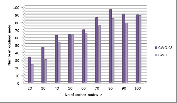 We have analyzed that a 100-meter square area is giving optimal results for minimum node localization error and number of detected anchor nodes. For 100 square meter area, the 80 anchor nodes have the best result as we have a total of 200 nodes and out of those nodes 120 nodes are at unknown positions, and our method is able to localize 115 nodes out of those, which means 95.8% nodes are localized which is 13.8% more than GWO results. A comparative analysis for the percentage of localized nodes will be the conclusion and a bar chart is shown in the figure for it.