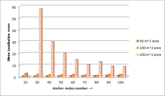 - For the 100 square meter area, the 80 anchor nodes have the best result as we have a total of 200 nodes and out of those nodes, 120 nodes are at unknown positions, which means 95.8% of nodes are localized which is 13.8%.