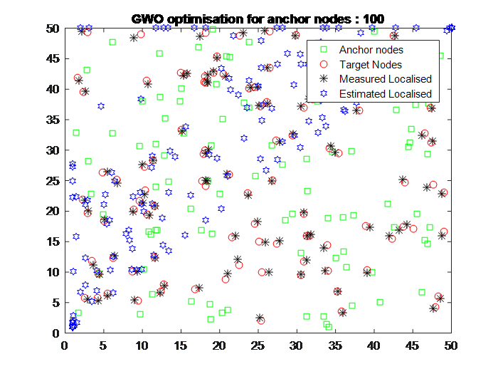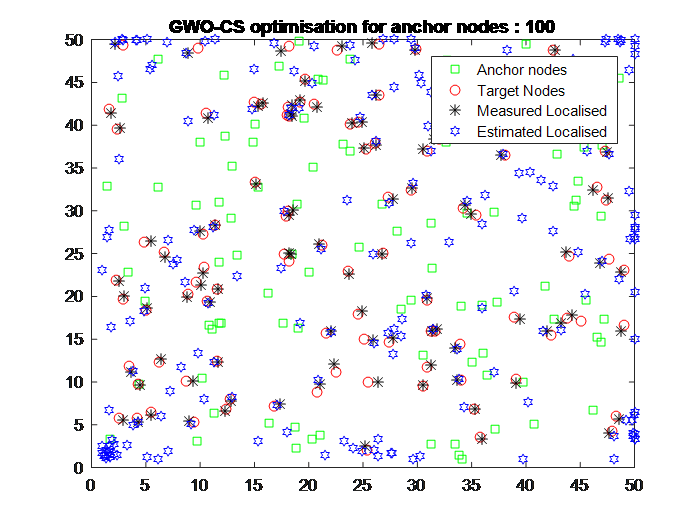Our work is focused on developing the MATLAB code for node localization. To know the locations, some nodes’ positions must be known or it can be said only a few nodes with higher battery capacity must have GPS installed. An unknown node can be located by measuring the distance by received signal strength index (RSSI) which is fine-tuned by heuristic optimization algorithms. We focused on grey wolf optimization (GWO) for this purpose but it suffers from the behavior of falling into local minima. The research paper on WSN localization using GWO can be read here. So the finely tuned distance of unknown localized nodes by this method can’t be reliable. So we introduced a hybrid method that overcomes the weakness of GWO and gives it the strength of global optimization. We used the cuckoo search optimization algorithm along with the GWO. CS updates the best three solutions of GWO which are alpha_wolf, beta_wolf, gamma_golf.